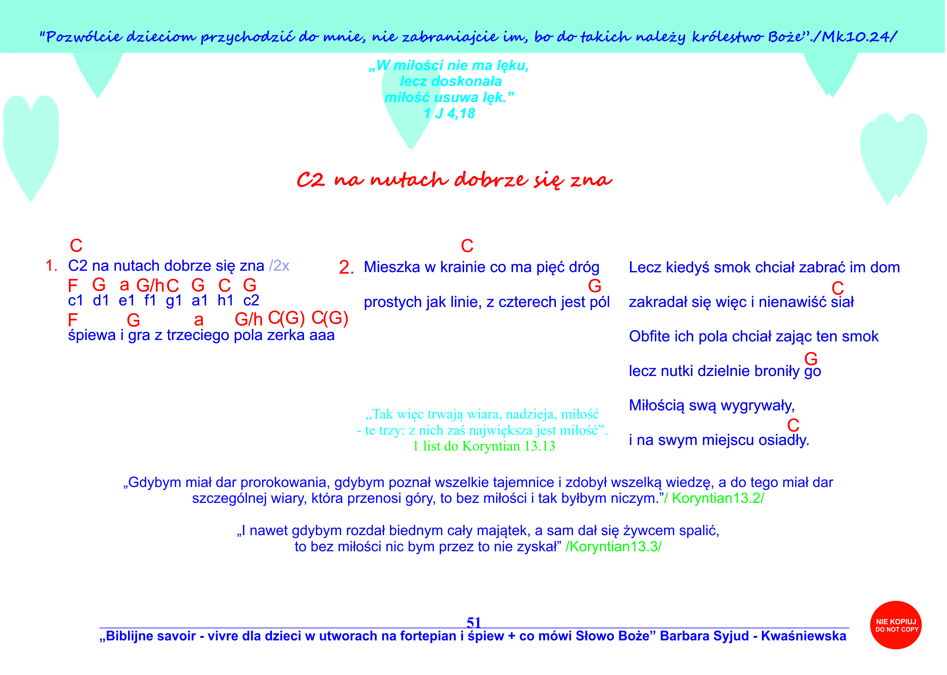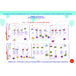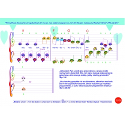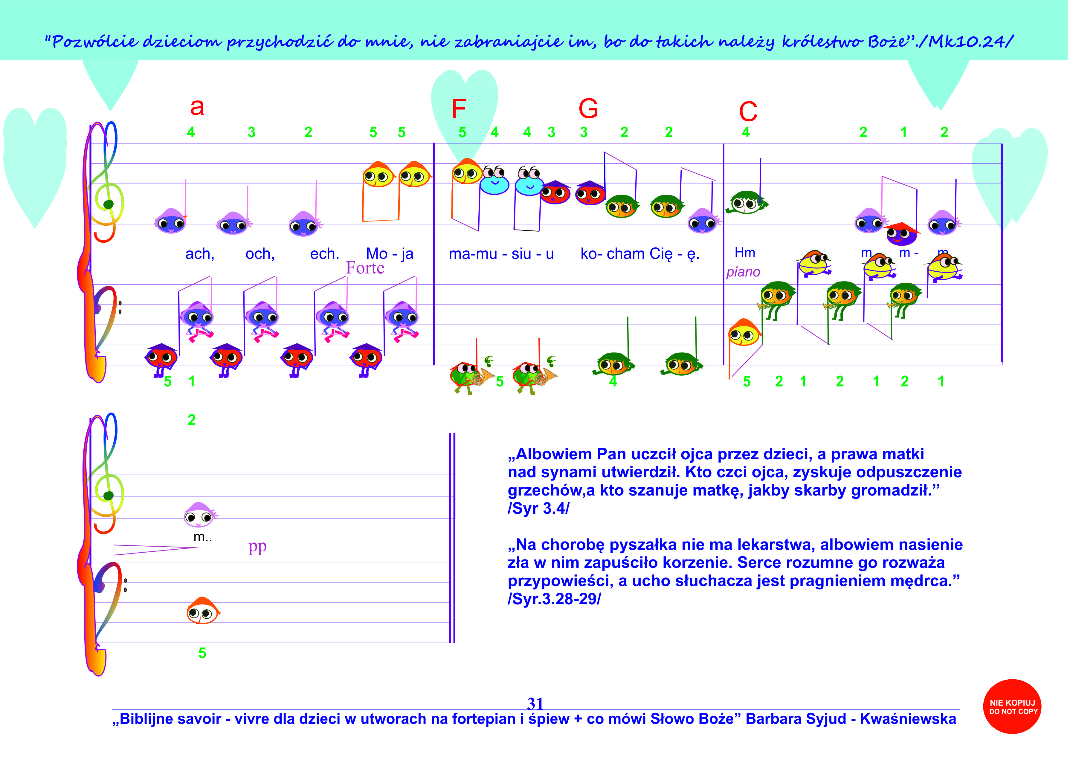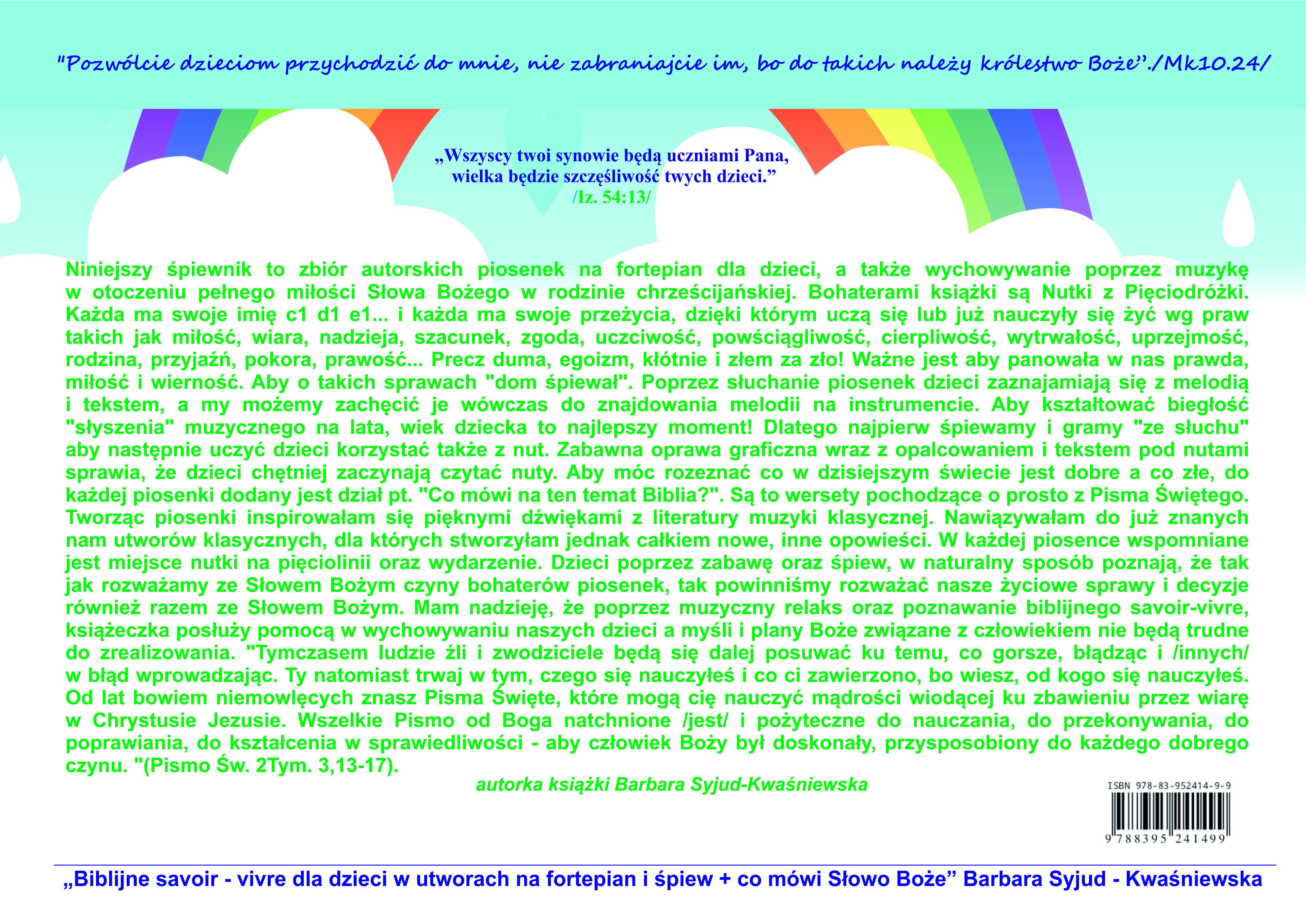 Niniejszy śpiewnik to zbiór moich autorskich piosenek dla dzieci, a także wychowywanie poprzez muzykę w otoczeniu pełnego miłości Słowa Bożego w rodzinie chrześcijańskiej. Bohaterami książeczki są Nutki z Pięciodróżki. Każda ma swoje imię c1 d1 e1... i każda ma swoje przygody, dzięki którym uczą się lub już nauczyły się żyć wg praw takich jak miłość, szacunek, zgoda, uczciwość, powściągliwość, cierpliwość, wytrwałość, uprzejmość, rodzina, wiara, przyjaźń, pokora, prawość... Precz duma, egoizm, kłótnie i złem za zło! Ważne jest aby panowała w nas prawda, miłość i wierność. Aby o takich sprawach "dom śpiewał". Aby móc rozeznać co w dzisiejszym świecie jest dobre a co złe, do każdej piosenki dodany jest dział pt. "Co mówi na ten temat Biblia?". Są to wersety pochodzące z Pisma Świętego. Tworząc piosenki inspirowałam się pięknymi dźwiękami z literatury muzyki klasycznej. Nawiązywałam do już znanych nam utworów klasycznych, dla których stworzyłam jednak całkiem nowe, inne opowieści. W każdej piosence wspomniane jest miejsce nutki na pięciolinii oraz wydarzenie. Dzieci poprzez zabawę oraz śpiew, w naturalny sposób poznają, że tak jak rozważamy ze Słowem Bożym czyny bohaterów piosenek, tak powinniśmy rozważać nasze życiowe sprawy i decyzje również razem ze Słowem Bożym. Poprzez słuchanie piosenek dzieci zaznajamiają się z melodią, a my możemy zachęcić je wówczas do znajdowania jej "ze słuchu" na instrumencie. Aby kształtować biegłość "słyszenia" muzycznego na lata, wiek dziecka to najlepszy moment! Dlatego najpierw śpiewamy i gramy "ze słuchu" aby następnie uczyć się korzystać także z nut. Zabawna oprawa graficzna wraz z opalcowaniem i tekstem pod nutami sprawia, że dzieci chętniej zaczynają czytać nuty. Mam nadzieję, że poprzez muzyczny relaks oraz poznawanie biblijnego savoir-vivre, książeczka posłuży pomocą w wychowywaniu naszych dzieci a myśli i plany Boże związane z człowiekiem nie będą trudne do zrealizowania. "Tymczasem ludzie źli i zwodziciele będą się dalej posuwać ku temu, co gorsze, błądząc i /innych/ w błąd wprowadzając. Ty natomiast trwaj w tym, czego się nauczyłeś i co ci zawierzono, bo wiesz, od kogo się nauczyłeś. Od lat bowiem niemowlęcych znasz Pisma Święte, które mogą cię nauczyć mądrości wiodącej ku zbawieniu przez wiarę w Chrystusie Jezusie. Wszelkie Pismo od Boga natchnione /jest/ i pożyteczne do nauczania, do przekonywania, do poprawiania, do kształcenia w sprawiedliwości - aby człowiek Boży był doskonały, przysposobiony do każdego dobrego czynu." (Pismo Św. 2Tym. 3,13-17).